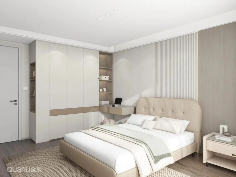 若是想在悬浮柜的基础上增加储物空间,可以考虑在柜体下方加设抽屉,收纳常用小物件,抽屉上方还能放置书籍摆件等,搭配灯光设计,与定制床头柜结合,增加空间层次,视觉更显高级。