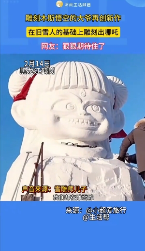 2月16日,黑龙江省鹤岗市出现了一座高达6米的雪雕哪吒,吸引了众多市民和游客前来观赏。这座雪雕作品由曾雕刻佳木斯黑悟空的雪雕师创作,其儿子表示,这是在旧雪人的基础上“诞生”的,目的是为了让家乡人回来后有一个溜达打卡的地方。