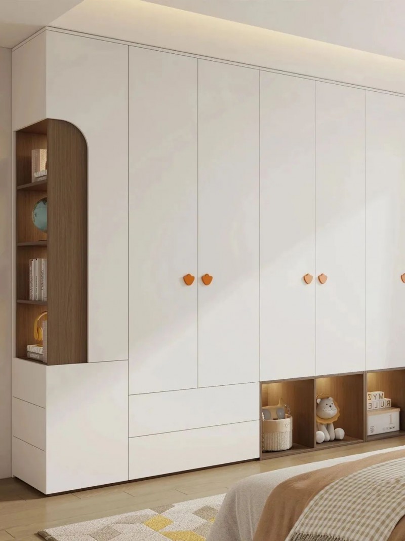 ① 儿童房衣柜创新设计底部开放格与侧边绘本架,培养儿童自主收纳习惯,小鸭子脚蹼拉手与圆角防撞工艺体现细节关怀。