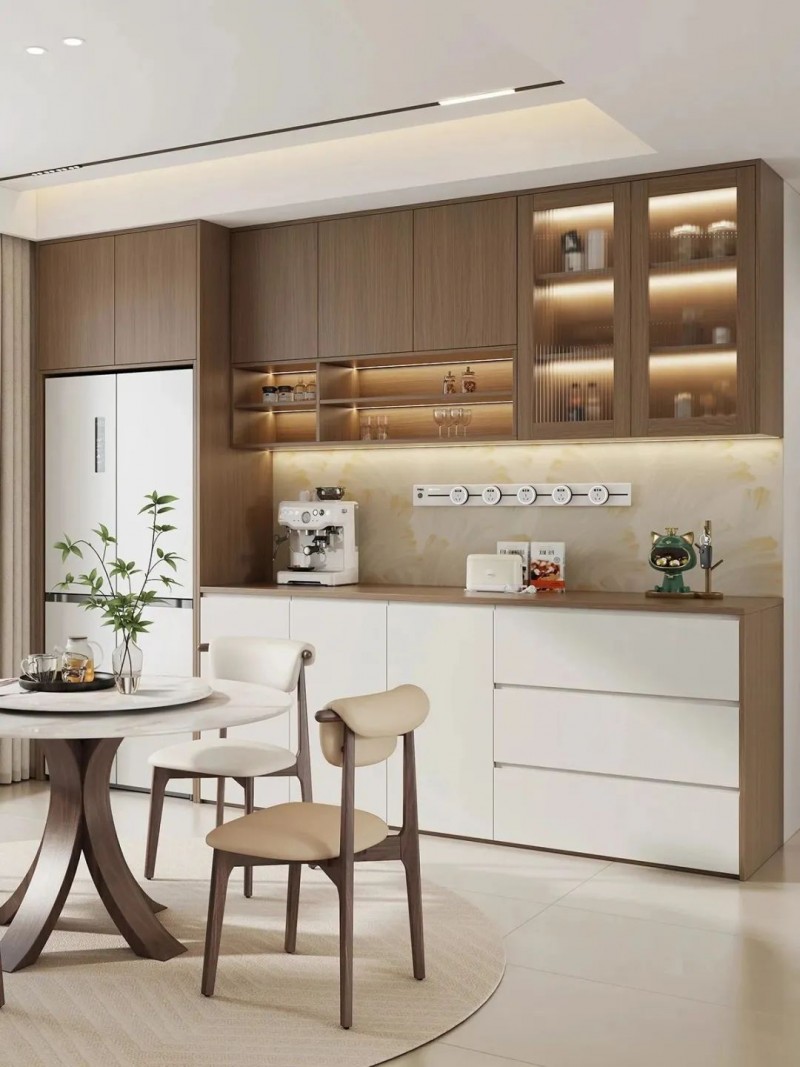 ① 餐边柜运用胡桃木吊柜与哑光白柜门构成色彩矩阵,玻璃门内嵌线性光源,搭配可移动滑轨插座,形成艺术陈列与小型厨房电器的双重服务区。
