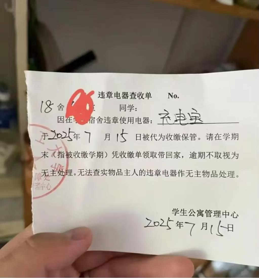 事情起源于7月15日,一位学生晒出了自己收到的《违章电器查收单》。单据显示,因使用未经许可的充电宝,其个人物品已被代为收缴保管。根据单据上的说明,学生可在学期末凭借收缴单领取归还物品,否则将被视为自动放弃。
