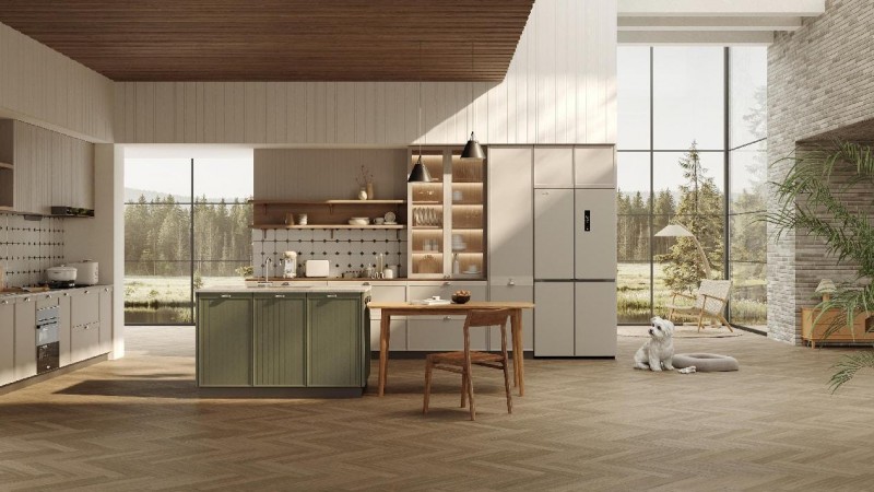 配色上,卡尔橡木以温润肌理与低饱和色调相互映衬,为厨房注入一抹清新与灵动,也让身心在此获得片刻放松。「拾光+」橱柜提供莫奈灰与苔藓绿两款主色选择,莫奈灰柔和静谧,苔藓绿自然治愈,演绎出不同的北欧风情。