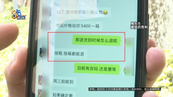 周先生:买之前承诺我的话,单瓶单箱都能退的。然后跟你后面的话有出入,我肯定不同意啊。后面有谈过几次,也是没有谈成。