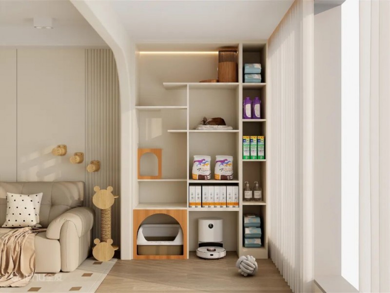 阳台柜通过精细化分区设计,左侧设置开放式猫爬架与隐藏式猫砂盆,满足猫咪活动与如厕需求;右侧通过垂直收纳实现宠物用品分类。柜体顶部配备智能感应灯带,底部预留扫地机器人基站位,在有限空间内实现宠物生活与家居收纳的双需求。