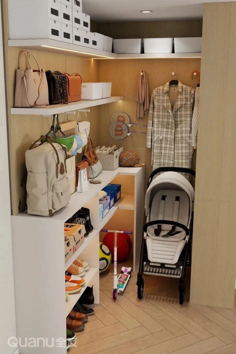 入户打造800库,即进深为800mm的步入式独立收纳空间。