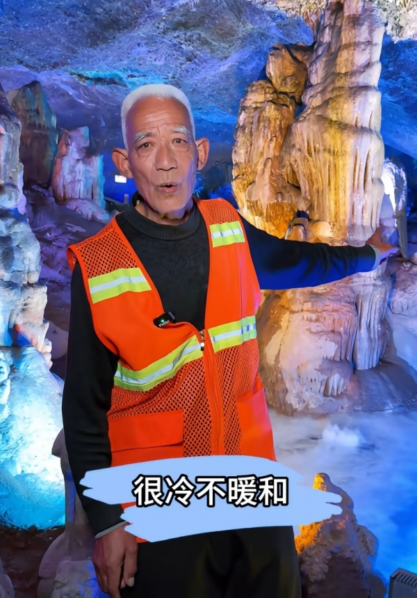 赵大爷那有点"不正经"的反向宣传,看着像瞎闹,但仔细想想,每句话都是景区的重点。当他磕磕巴巴地说出"这叫满目星辰"时,镜头里的钟乳石在灯光的照射下闪闪发光,感觉好比真的置身星海一般。