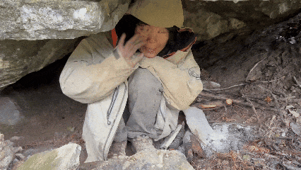赛事视频显示,17号选手"冷美人"杨朝芹蜷缩在一个高约一米的山洞里,冲着镜头笑着打招呼:"我太幸运了,没有被雨淋到。"其状态略显疲惫。