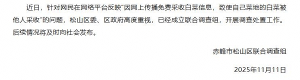 11 日晚,赤峰市松山区发布情况通报,称针对网民在网络平台反映 " 因网上传播免费采收白菜信息,致使自己菜地的白菜被他人采收 " 的问题,松山区委、区政府高度重视,已经成立联合调查组,开展调查处置工作,后续情况将及时向社会发布。