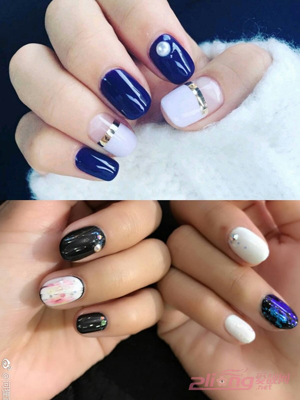 蓝色系的美甲,这种是很显高级感的款式,深浅不一样的颜色组合,加上小精致的珍珠点缀,这样的指甲彩绘你们爱吗?另一款珍珠美甲,波点图案,还有金属配饰和珍珠,这样的美甲珍珠款式,很简约,很美。
