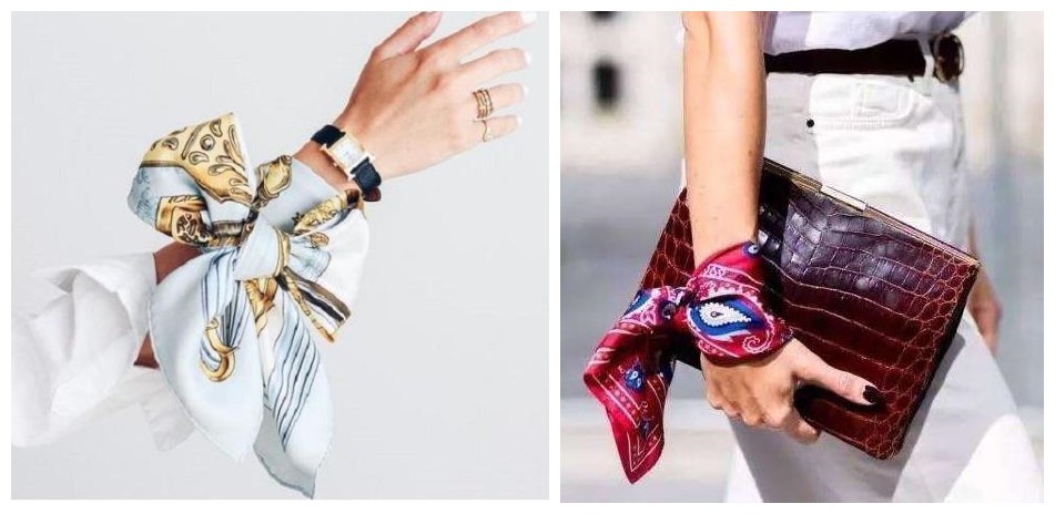 很多制造商设计包包造型的时候,就已经想到了用丝巾作为包带,得到造型更加升级,更加精美,用丝巾绕着包带转一圈,增添了包包本来没有的色彩感,又或者用丝巾直接绑在包包的一边,随风飘逸更显得有大气感,轻松给自身的品位提升一个档次!