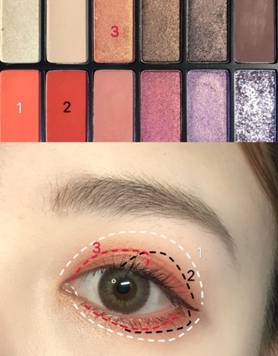 2、在接近眼睫根部的眼皮后2/3处和后半截下眼睑上涂上2号眼影。