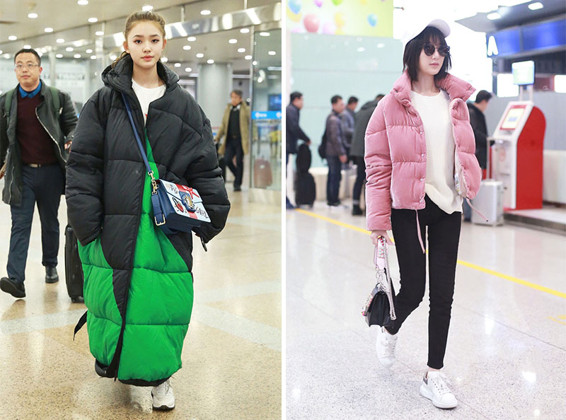 不论是时尚博主还是明星,都爱将短款羽绒服敞开斜穿。将一边肩部微微露出来,突破常规的穿法也营造了一种不对称的美。虽然这种穿法的装饰性大于实穿性,但其实只要我们选择比较厚实保暖的内搭,出门逛街时也还是可以尝试下这种穿搭,没准回头率还高呢。