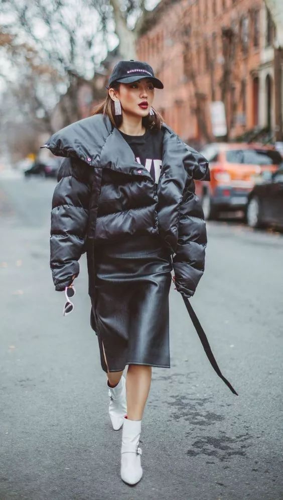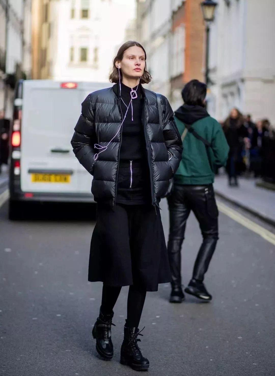 黑色羽绒服容易看起来沉闷,可以在细节处进行修饰加分。露肩穿尽显不羁感、卫衣长一点增加层次感、让羽绒和皮质进行材质碰撞。