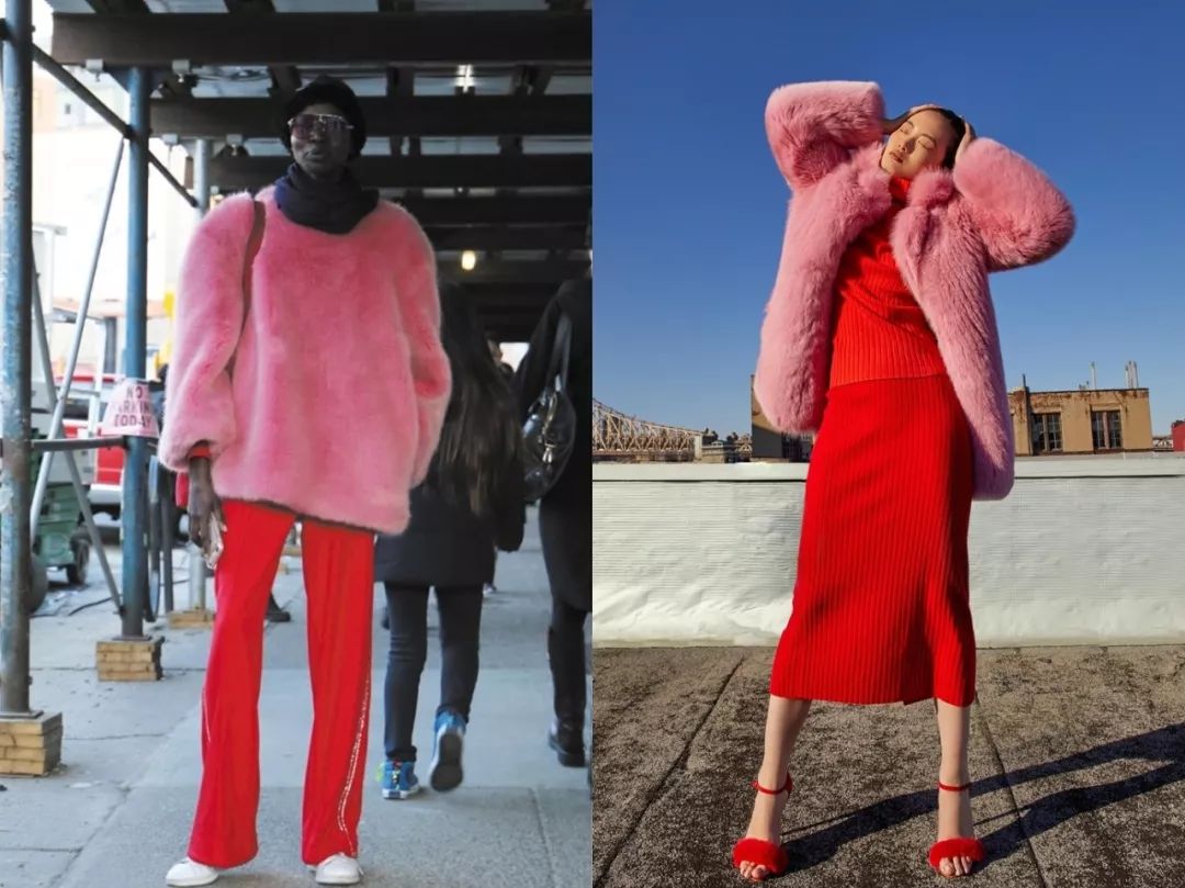 同样把复古牛仔蓝跟热情正红色搭配得很值得借鉴的还有Aimee Song,一身牛仔装束作为内搭,红色的人造皮草大衣也丝毫不俗气了▼