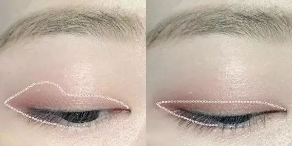 眼影宽度略高于眼褶2毫米(右图虚线的位置)。如果我们将眼皮褶看做“地平线”,露在眼褶外的清浅眼影像不像高于地平线的落日余光?女星同款大眼黄金线,因而得名“落日线”。