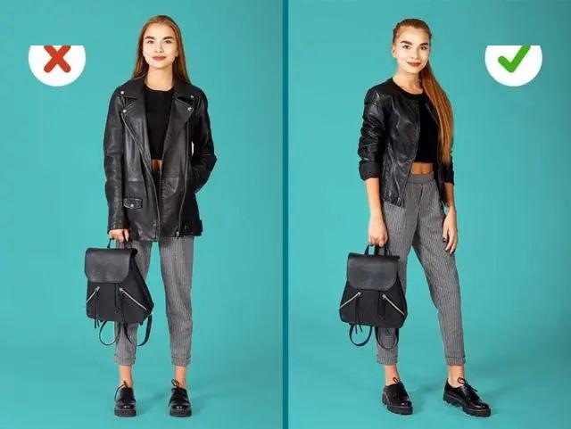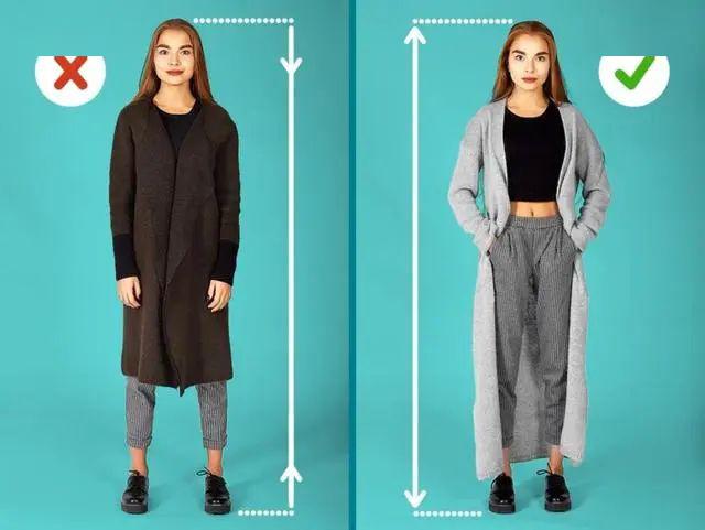 上衣过长就会造成比例失衡,腰线都掉到大腿了,整个人看上去当然老气还臃肿。这个时候就要注意提升腰线,调整比例。
