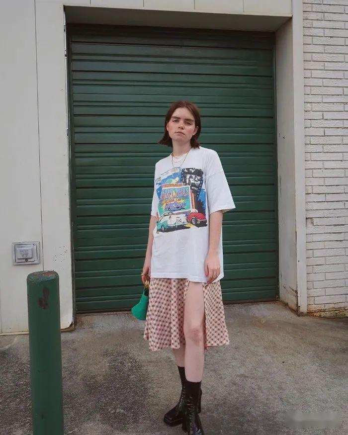 如果你的T恤有点大,搭配半裙时,可以参考下面look,稍稍掖一边在裙子里,露点腰线,这样松松垮垮的穿搭也很受人们的欢迎。