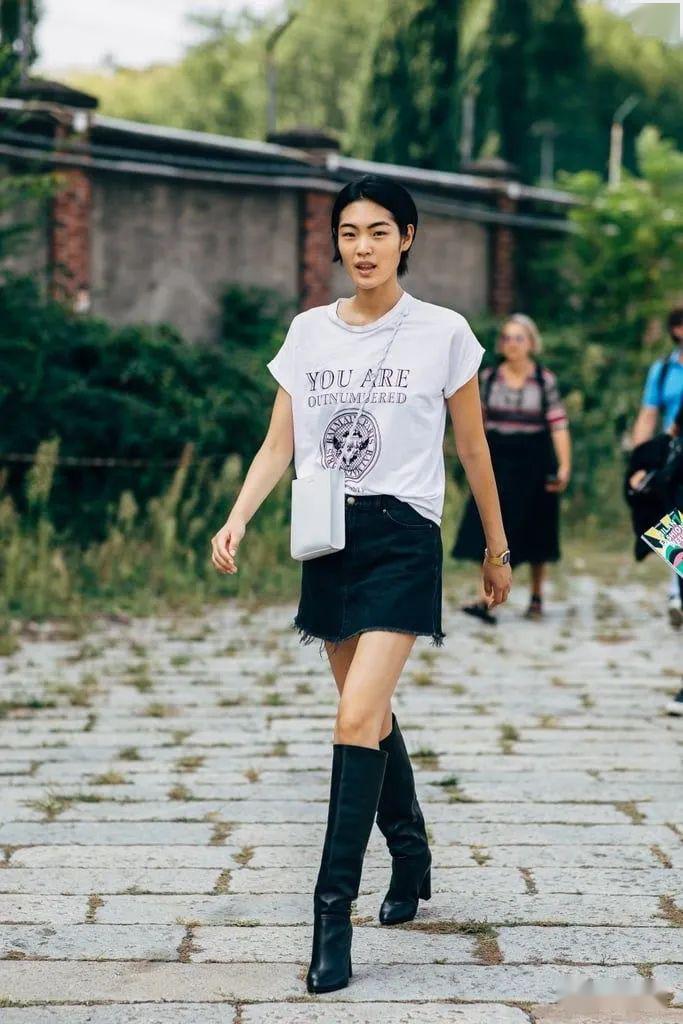 如果你的身高在线身材再纤细一点,可以参考下面的穿搭,直接把T恤放下来穿,不必放在裙子里,T恤和裙子的叠穿,这样的look特别显随意,如果想要更高级一点,可以用单色半裙和单色T恤打造。
