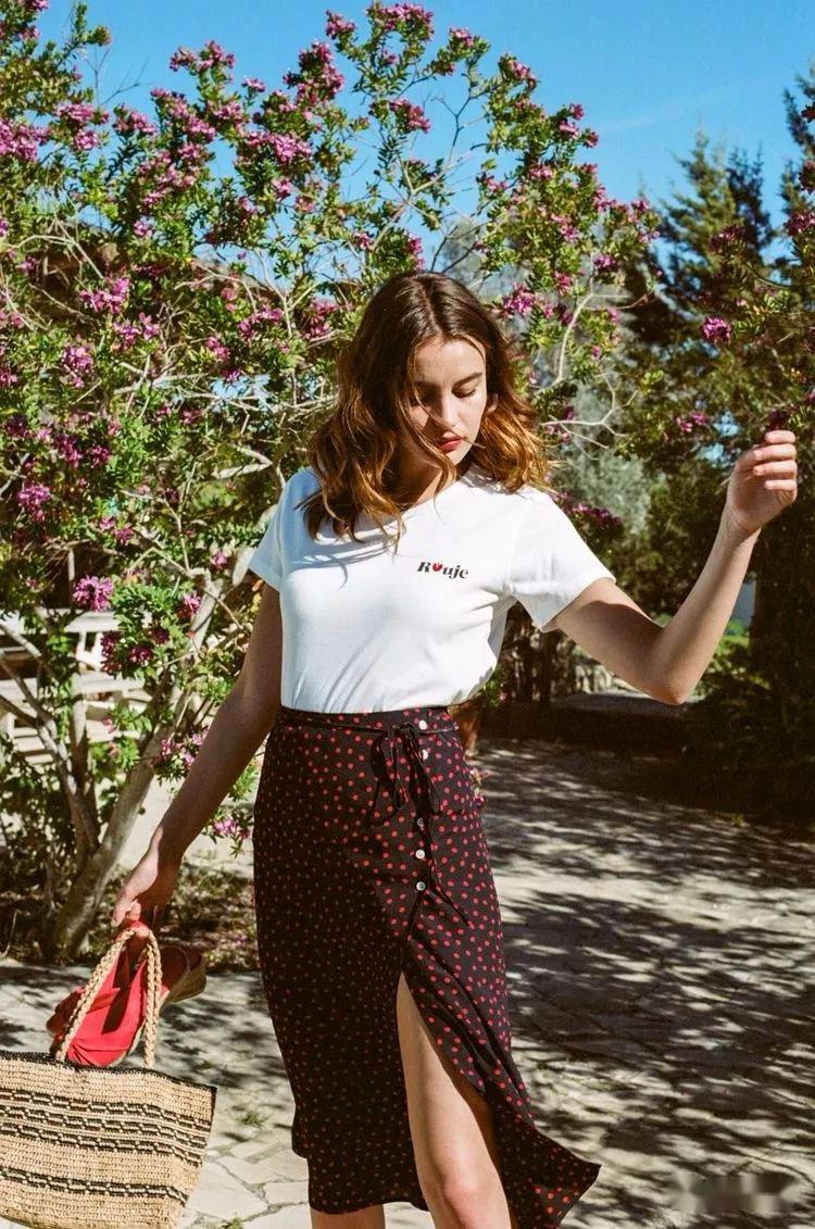 不管哪一件T恤,开叉半裙今年依然受欢迎,不管是时尚博主还是普通路人都喜欢用 一件T恤配下面这件波点或者小碎花裙,尤其是法国博主的牌子rouje,这种单品也是主要打造法式浪漫风的关键单品!