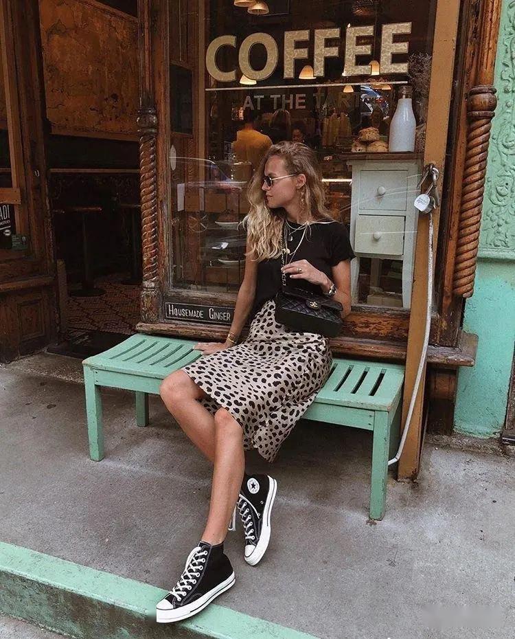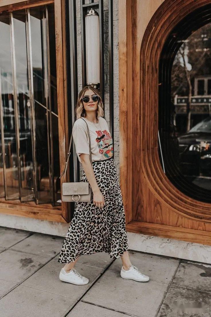 印染类额半裙每年都比较流行,相对于夏天来说,它简单实用,可以和各类T恤混搭,除了印花款,今年比较流行的就是动物图案款,尤其是豹纹款,不要觉得她老气,只有年轻人穿着才更显年轻哦,当然配T恤就在黑白色系选择,减龄一点的可以穿帆布鞋。