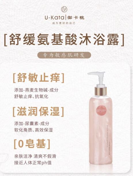 御卡桃舒缓氨基酸沐浴露,是专业护肤品公司妆莱控股旗下御卡桃品牌的一款全新身体护理产品。产品专为敏感肌研发,针对夏日皮肤干燥皮屑,瘙痒发痘,晒后易红等敏感问题,添加温和高效核心抗敏修护成分,让你的皮肤焕发少女高光。
