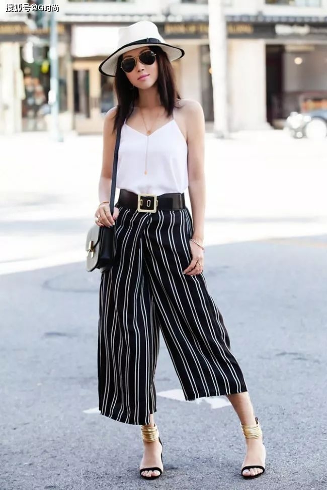 白色的吊带背心搭配上显瘦的黑白条纹九分阔腿裤,用黑色宽皮带,秀出完美腰身,下穿凉鞋,清爽舒适的造型穿搭,满满的夏日感。