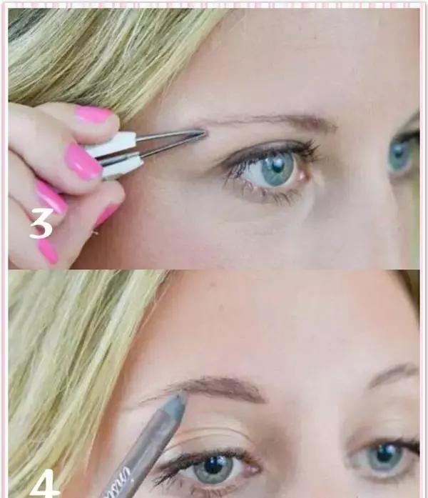 Step3+Step4:用拔眉的夹将眉毛处细小的杂毛拔掉,注意是拔除边缘的杂毛即可,拔太多的话会让眉毛产生空隙。用眉粉或者是眉笔,选择比发色浅一点的进行描绘眉型,从眉头开衫描绘到眉峰的位置,眉头的要画淡一些,到眉峰则开始画浓一些。
