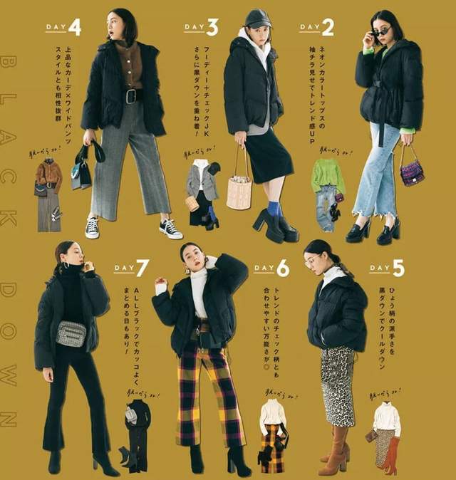 这两个要点同时也是冬季穿搭的秘诀。那接下来就以黑色羽绒服为例来聊聊冬季应该怎样来“造势”,我们一起来看看吧: