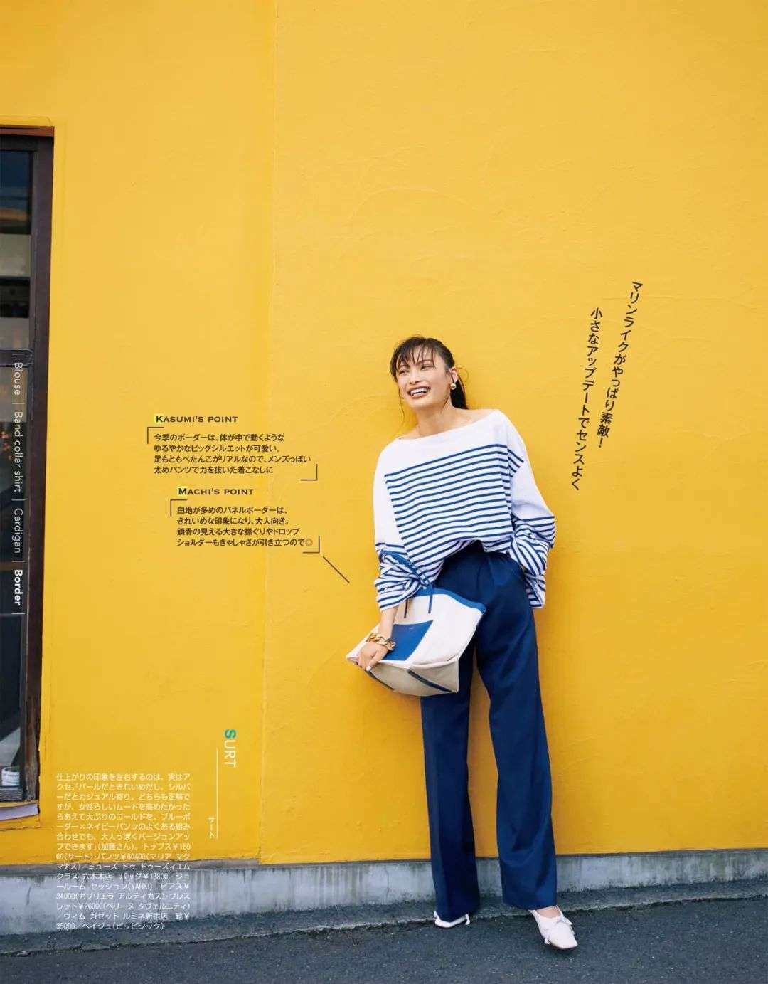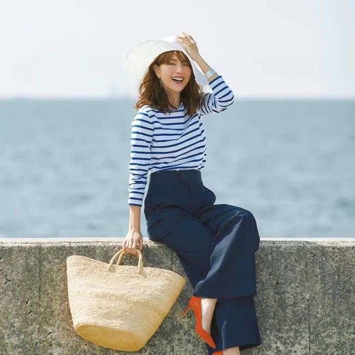 要点:条纹衫与白色或黑色阔腿裤搭配最易穿出气质感。