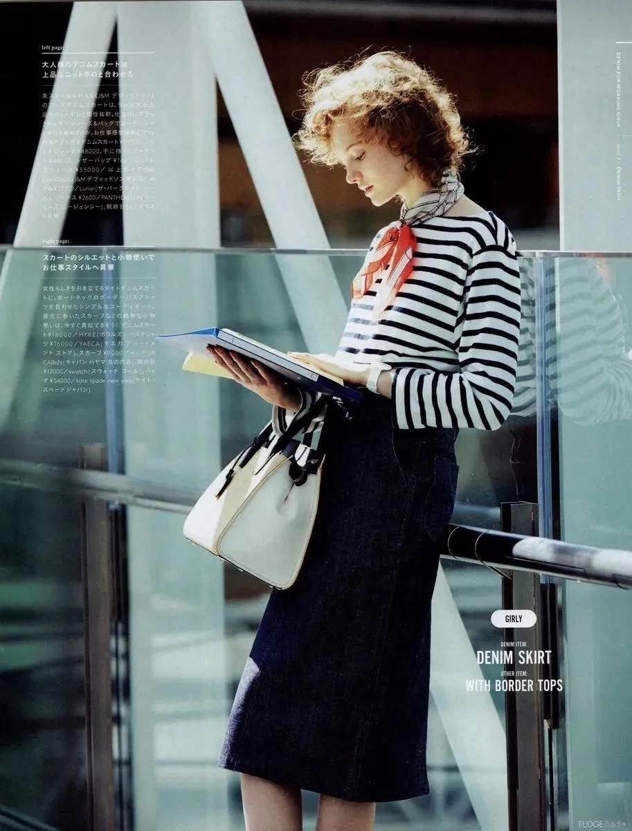 知识点:条纹衫在选择的时候要注意,宽松一点的会更百搭好看。另外,卷起袖口会增添一份时髦感。