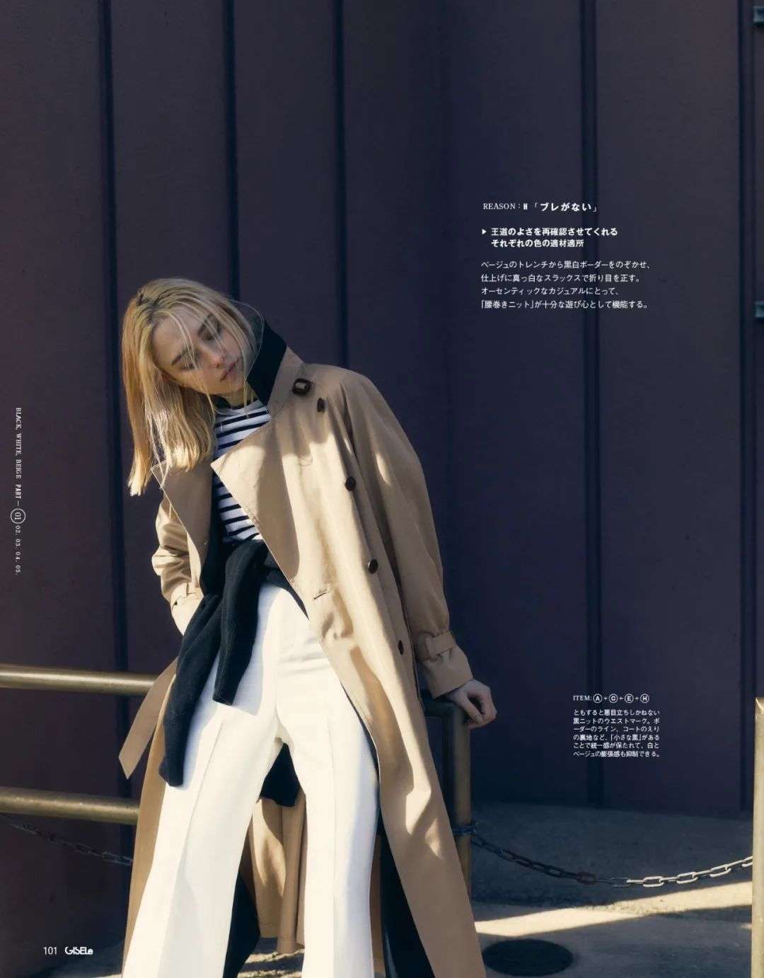 就如日杂中的法式风,带有法式慵懒风格的黑白条纹衫,搭配一条白色阔腿裤,简单又随意,但缺少了法式的精致,因此丝巾与贝雷帽的加入才是点睛之笔。