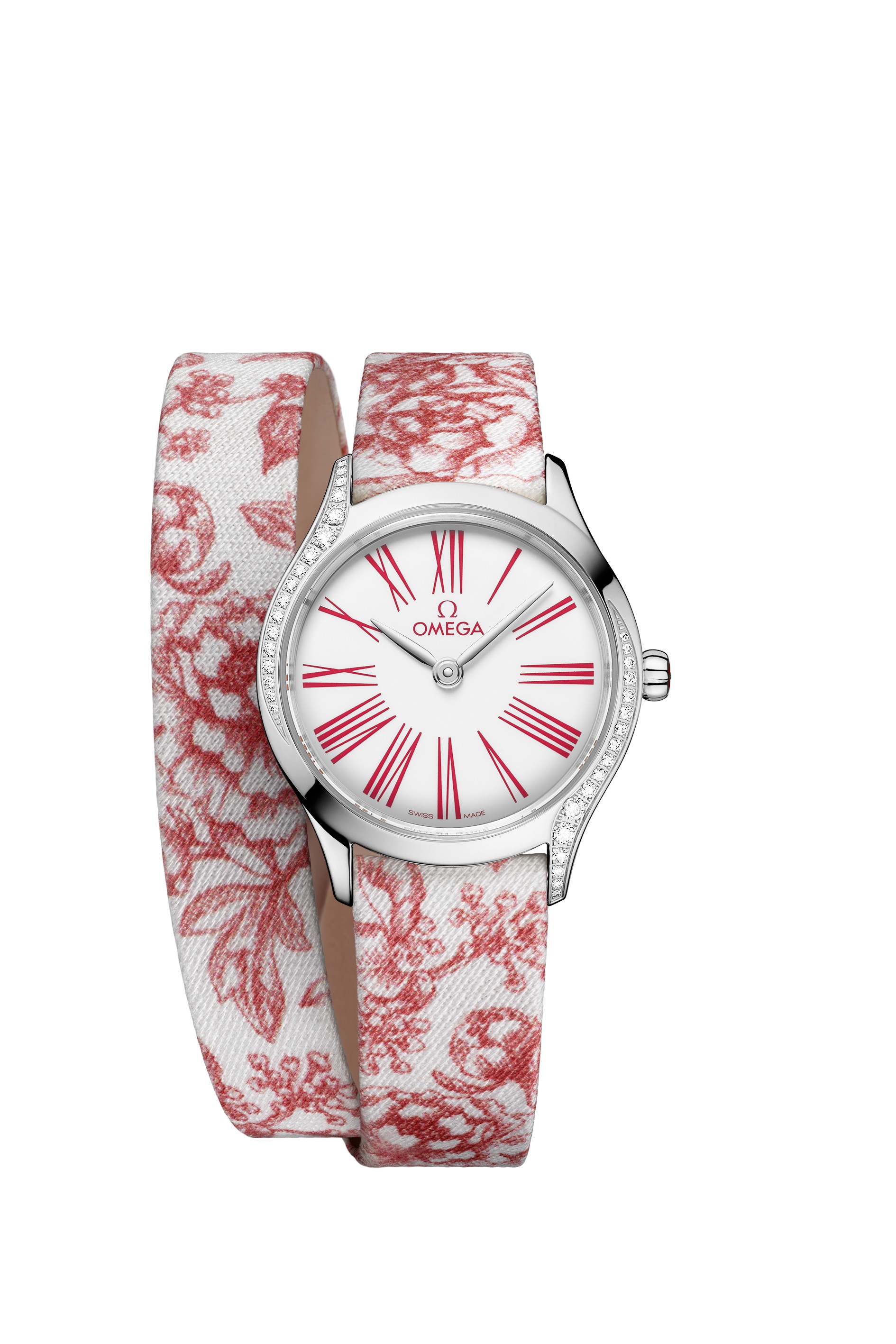 这款腕表的表壳尺寸仅为26毫米,精钢表壳两侧镶嵌有闪耀美钻,自然延伸至表耳,呈现出迷人的曲线。腕表搭配由“大明火”工艺制成的拱形米白色珐琅表盘,玫瑰红罗马数字刻度与红色花卉图案的“茹伊印花”双圈表带相呼应,摩登现代的设计为腕间增添别样魅力。