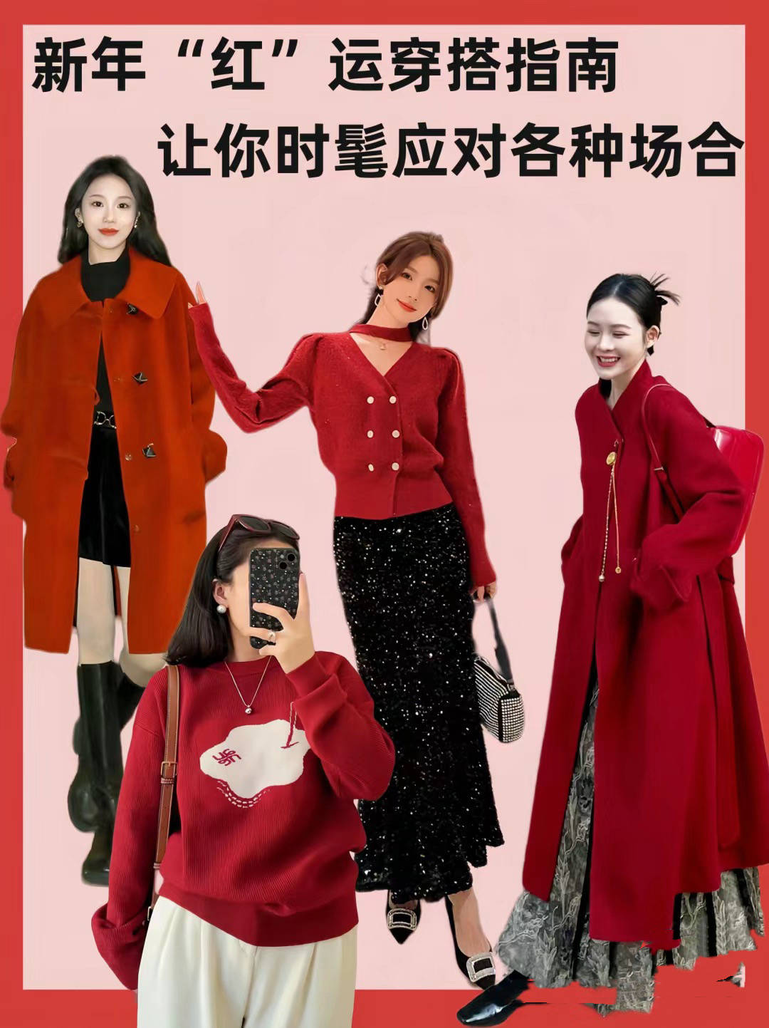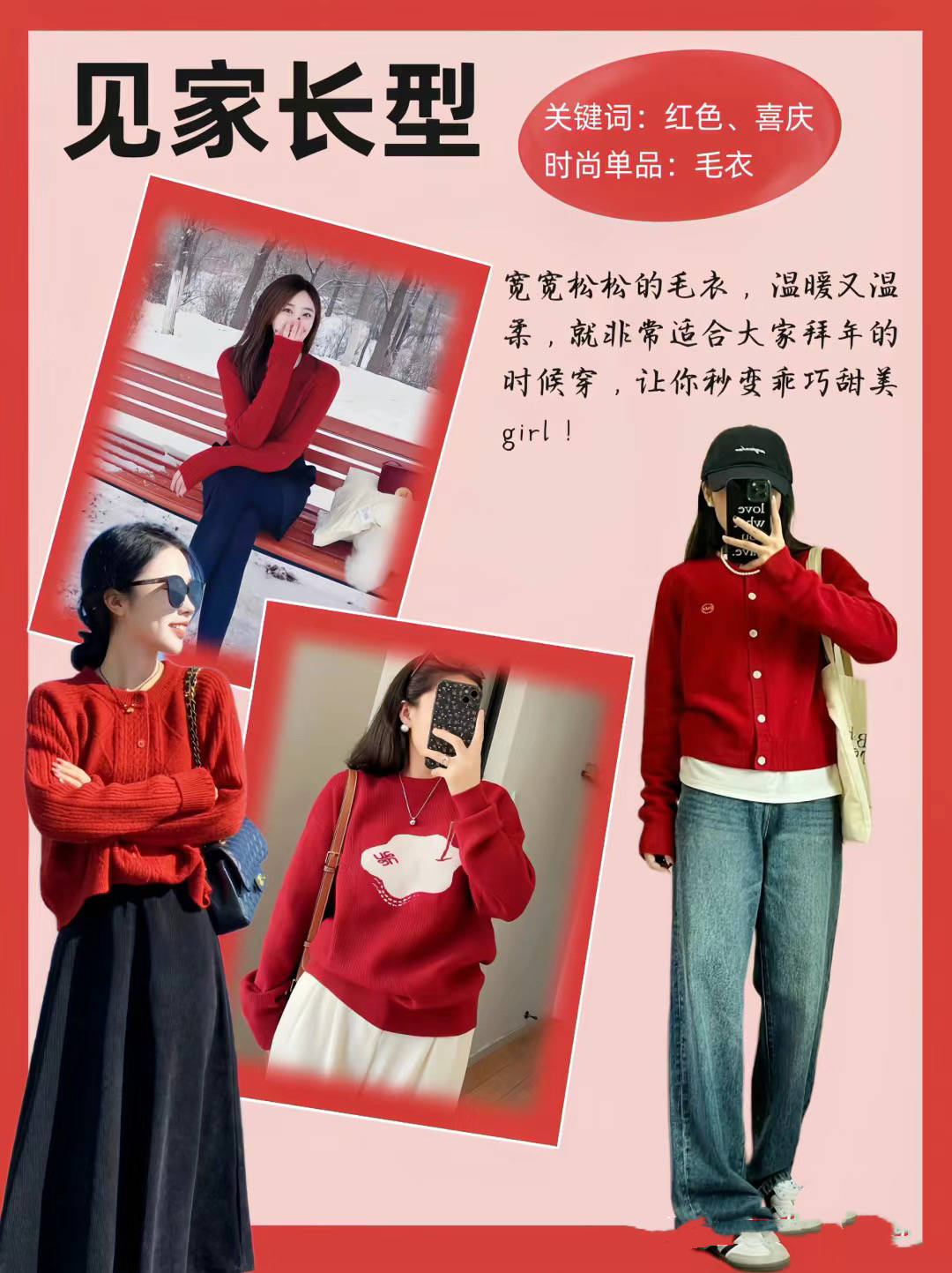 红色的针织衫、红色的卫衣、红色的毛衣,甚至是红色的大衣、红色的包包、红色的帽子、红色的配饰,都可以成为提升新年氛围感的细节元素。