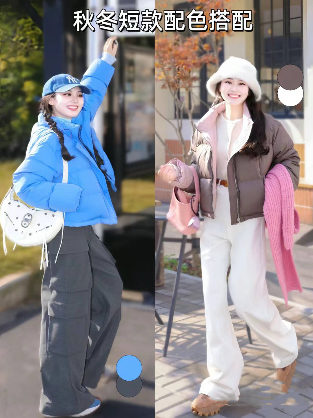 日常穿搭,以舒适大方为主。如果你的个子不够高,可以借鉴这一组短款羽绒服+高腰阔腿裤的穿搭模板。