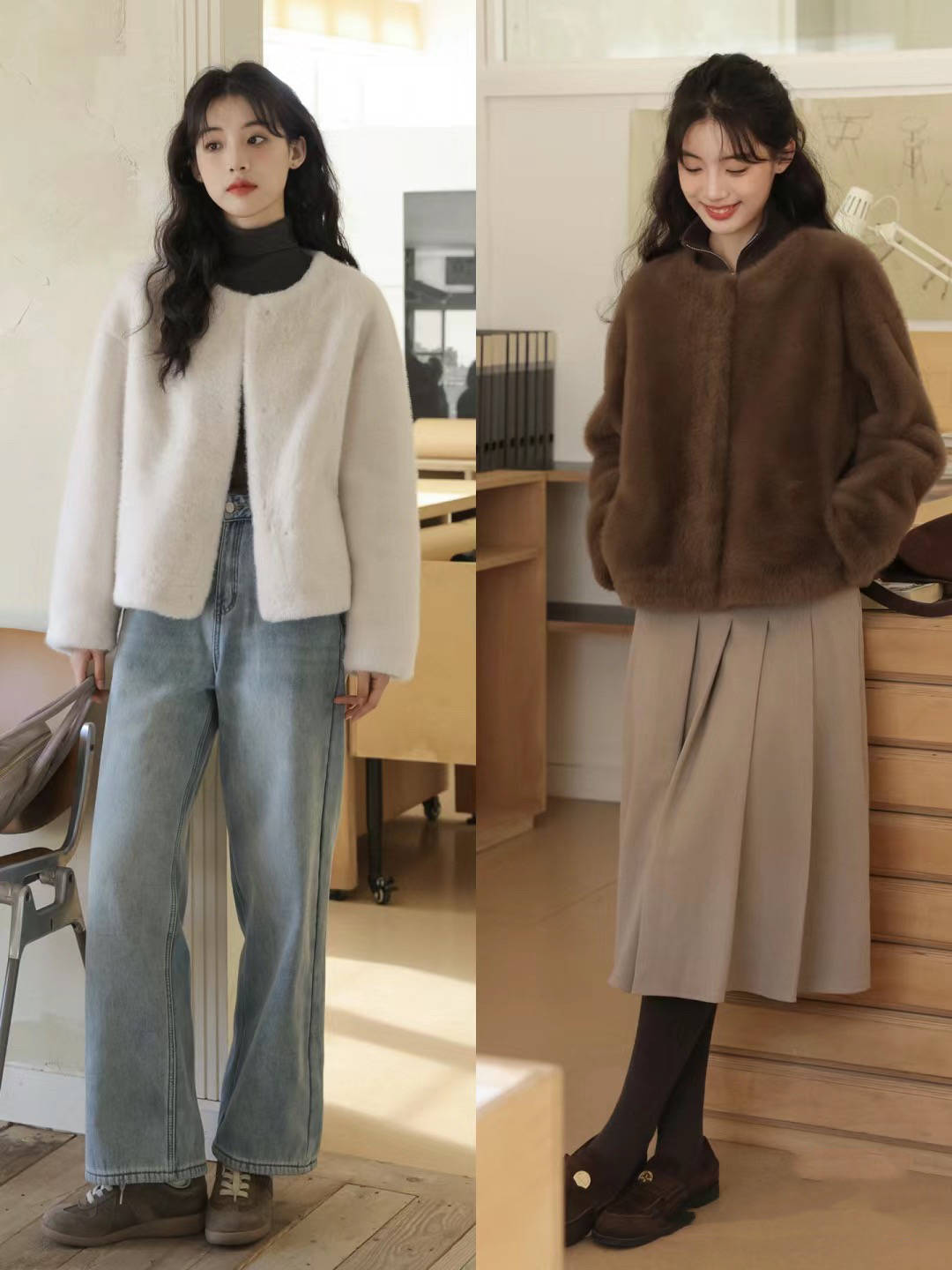穿短款的皮毛外套,不管是搭配直筒的牛仔裤、还是搭配高腰的百褶裙,都有着一种温柔且浪漫的美。尤其是经典的直筒牛仔裤,配稍微宽松的裤筒,微胖的小个子也能穿。
