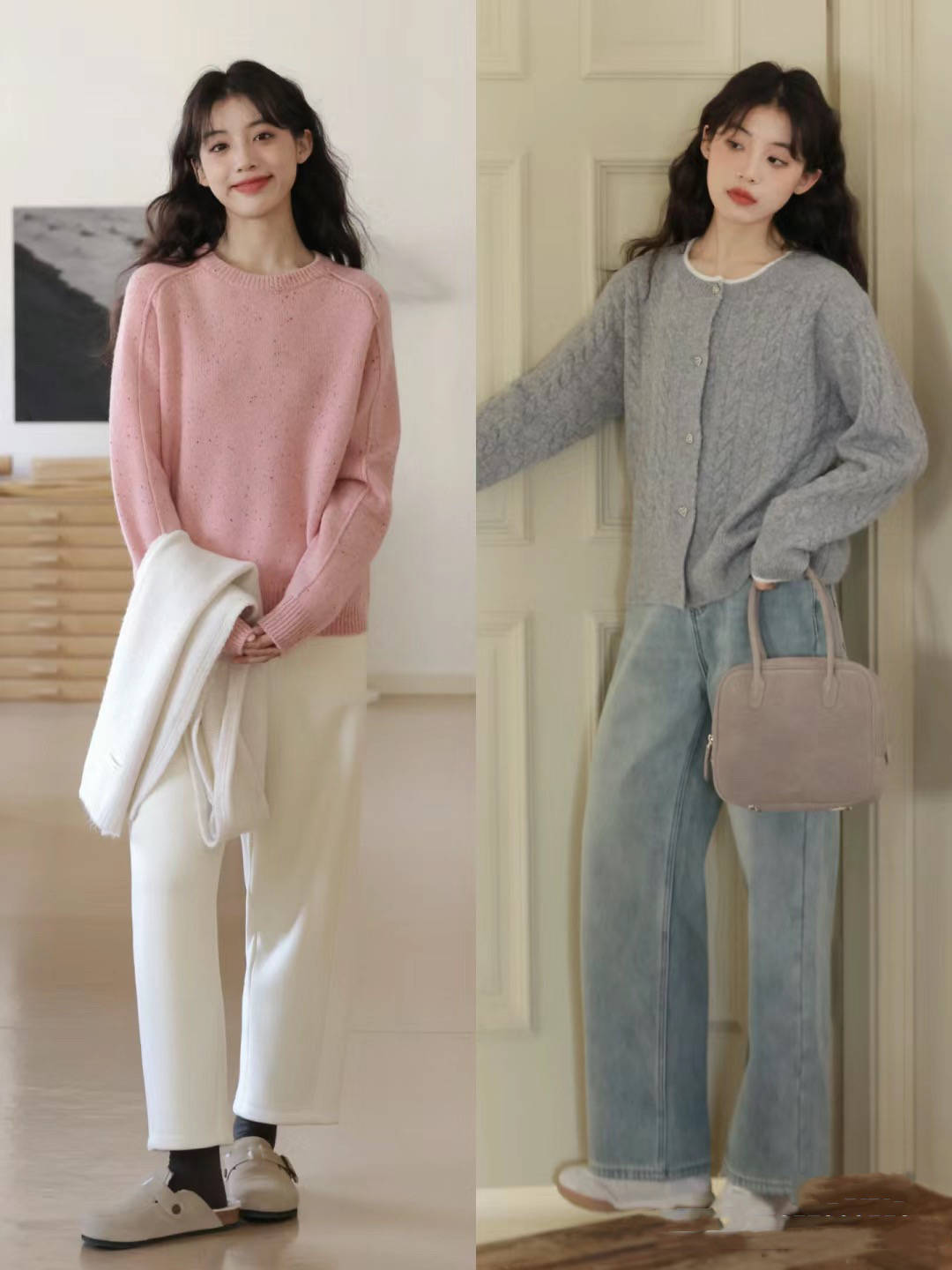 小个子女生,可以尝试这种利落又流畅的穿衣方式。浅粉色的针织衫,带着几分静谧与温柔,搭配上白色系的直筒裤,清清爽爽就格外的耐看。