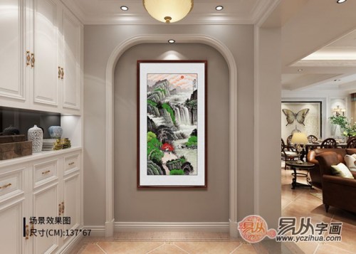 玄关是一个特殊的位置,与风水有着紧密的联系,在玄关挂一幅经典的山水画装饰,既能将玄关装饰得很美观,还能调节风水、挡煞镇宅。无论远观还是近赏都会给人赏心悦目的感觉,还可以提升居室的品位和体现居住者的涵养!