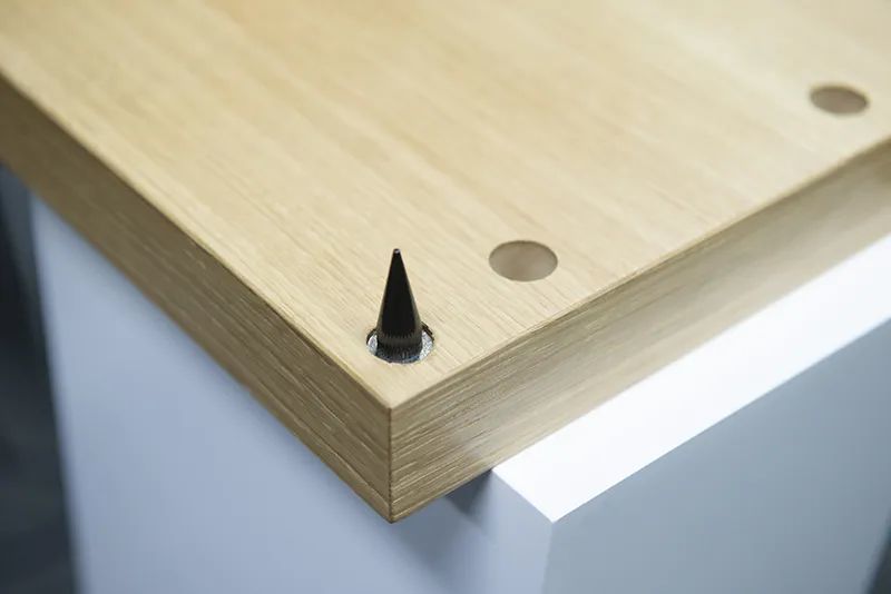 附赠的原木实心脚架和黑色脚钉做工颇为扎实,很有分量,主要用于降低谐振