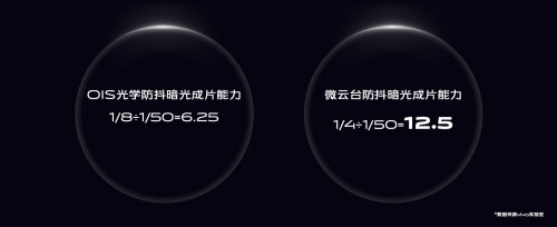 而微云台防抖则可以在1/4秒快门时长的情况下,达到与普通OIS光学防抖相同的成片,防抖暗光成片能力是无光学防抖的12.5倍,普通光学防抖暗光成片能力的2倍。