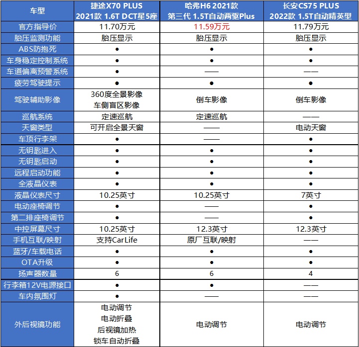在其他配置方面,三款车大同小异,不过从娱乐属性和实用性角度而言捷途X70 PLUS更为实在,因为该车支持CarLife,配备了6扬声器,若是出行时听听歌,看看剧效果更好一些。同时,捷途X70 PLUS后视镜功能更为丰富,当下雨或下雪时,后视镜加热功能可有效清洁镜面,保障行车安全;若是将车辆停在道路两侧,锁车自动折叠功能还能免除用户手动操作的繁琐。