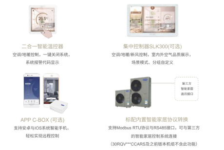 开利Mini VWV家用两联供空调的智能加湿功能会根据不同地区、不同季节来调节室内的湿度,非常智能。恒氧新风功能最能满足“健康住宅”的要求,采用Q Manager技术,专业管理室内空气品质,还有空气质量探测仪智能平衡室内含氧量,根据含氧量自动调节功率。中央除霾功能采用“摩擦带电驻极除尘技术”和“MAX循环除尘技术”,多重除尘,循环净化。强力除醛功能采用专业除甲醛滤网大幅降低新居、家具等有害挥发物的危害。气候管家功能能够协助客户调节室内温度、湿度、空气品质。并且具有远程开关、日程管理等功能。