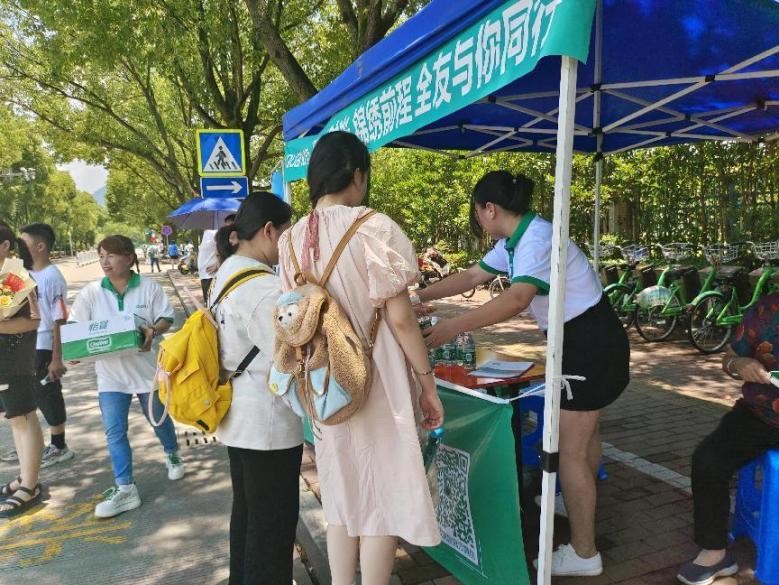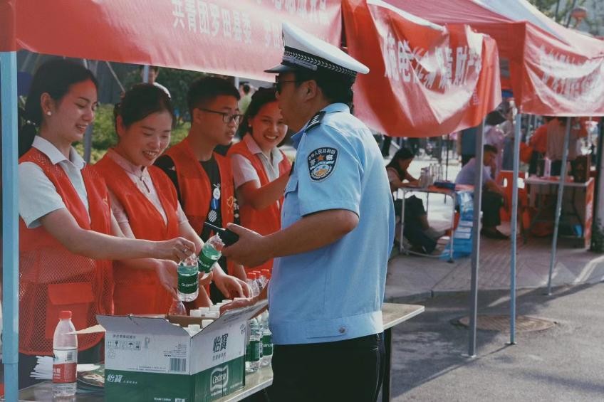 每场考试结束后,上林店的工作人员们又带着贴满祝福的瓶装水来到了考场门口,迎接考生。一瓶瓶满载爱心与祝福的水为每一位考生助力,志愿者用实际行动为考生服务,与考生同行。