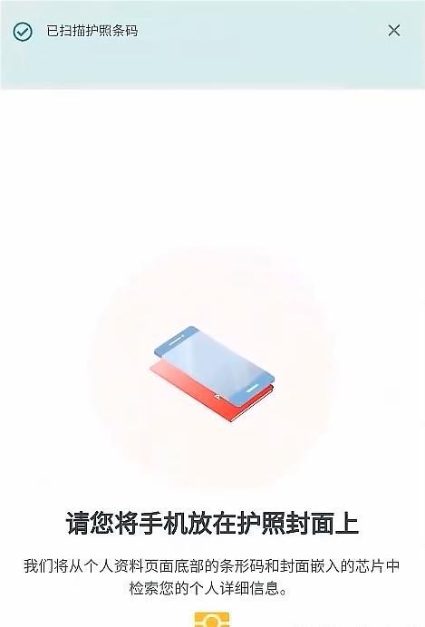 2)扫描护照条形码:打开你护照的个人信息页,根据画面提示扫描,注意光源充足,调整好角度,会自动扫描成功。