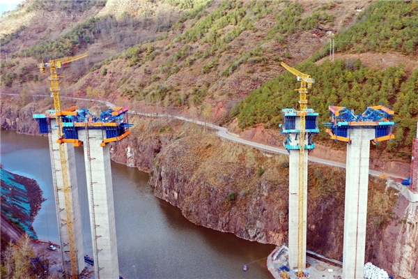 “我们拉通河道两侧便道,在河道侧筑岛,解决了库区涨水无法施工的难题,通过应用液压爬模和菱形挂篮施工,极大保证了高墩和上部结构施工安全高效推进,顺利实现全线首节现浇梁浇筑目标。”中铁十局西昭二分部项目总工张奉池介绍。