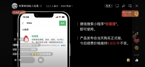 近日,校管家创始人伍星通过直播对外发布了一款全新的教务管理系统——“校猩猩”小程序。这款系统以其低廉的年费——目前仅需9.9元一年,迅速在市场上引起了轰动,吸引了超过12,000名观众观看直播发布会。
