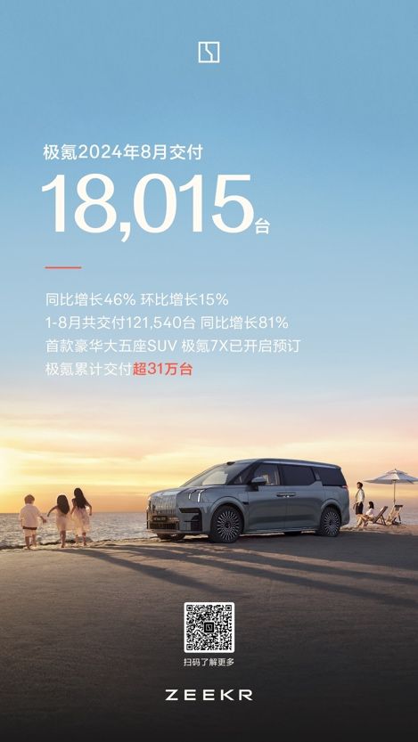 极氪8月交付18015台,同比增长46%,环比增长15%,同环比双增长。1-8月共交付121540台,同比增长81%。截至8月底,累计交付超31万台,持续刷新交付纪录。