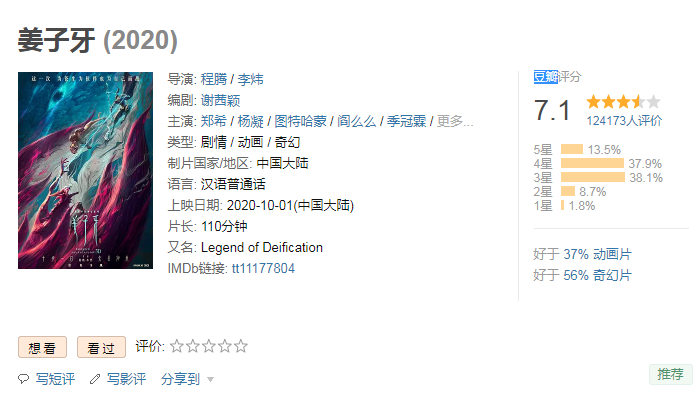 单看这个预售票房的话,这部作品还是很精彩的,在但是的豆瓣评分也是非常高。但现在却变得越来越低,只有7.1分,对于一部国漫电影作品来说,这个评分是非常低了。
