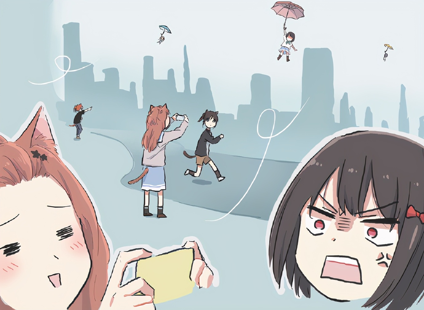 之前这位画师大佬绘制的这一类猫咪的主人系列同人都是小的那只是猫咪,大的那只是主人,看起来还有点像年轻妈妈带娃的感觉,不过最近这个系列作品反了过来,小的那位成了主人,而大的那位成为了猫咪,主人要照顾猫咪们的生活,但是因为身形小小只的,看起来就特别有意思了,比如这个下雨天里,外面刮着大风,这小小的身体举着伞很可能将就被风刮走了,看着就颇为有趣。
