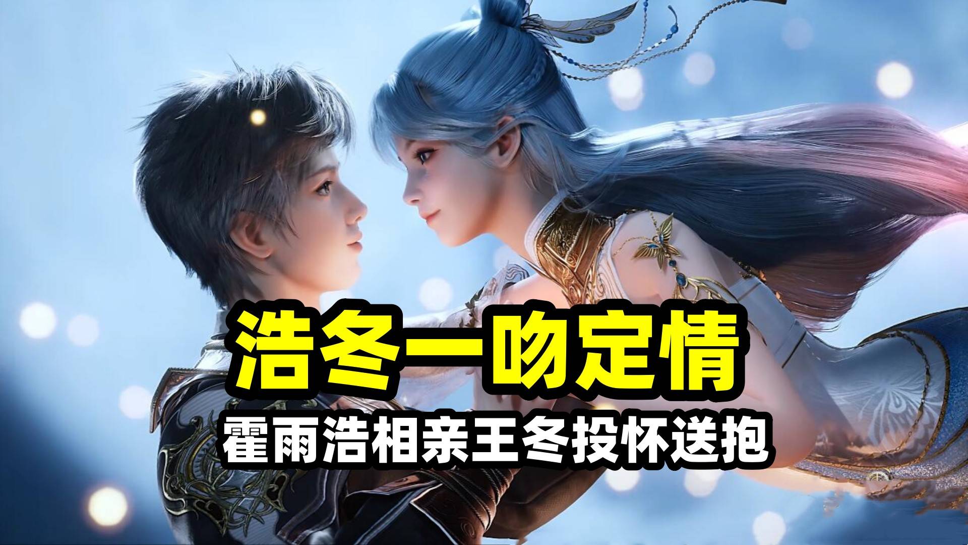 戴华斌为了拿下霍雨浩,直接使出邪眸白虎冲了上去。可惜在霍雨浩面前不堪一击,只见霍雨浩放出可爱的雪女,小小雪女仅仅伸出一根手指,瞬间就把邪眸白虎冻成冰雕。接着霍雨浩借用冰帝的力量玩了一波蝎子摆尾,仅仅只是甩了一下尾巴就把戴华斌瞬间揍飞。最后只剩下霍雨浩和王冬,随后就发生了开篇那一幕,霍雨浩变出一朵寒冰玫瑰,主动上前献出冰玫瑰,声称自己愿意用一生的时间去守护王冬。只见王冬摘下斗笠,一头飘逸的长发随风飘扬。接着王冬放出光明女神蝶,朝着霍雨浩直接扑了过来。两人就这样一吻定情拥抱在一起,作为吃瓜群众的我们瞬间又被狗粮喂饱。