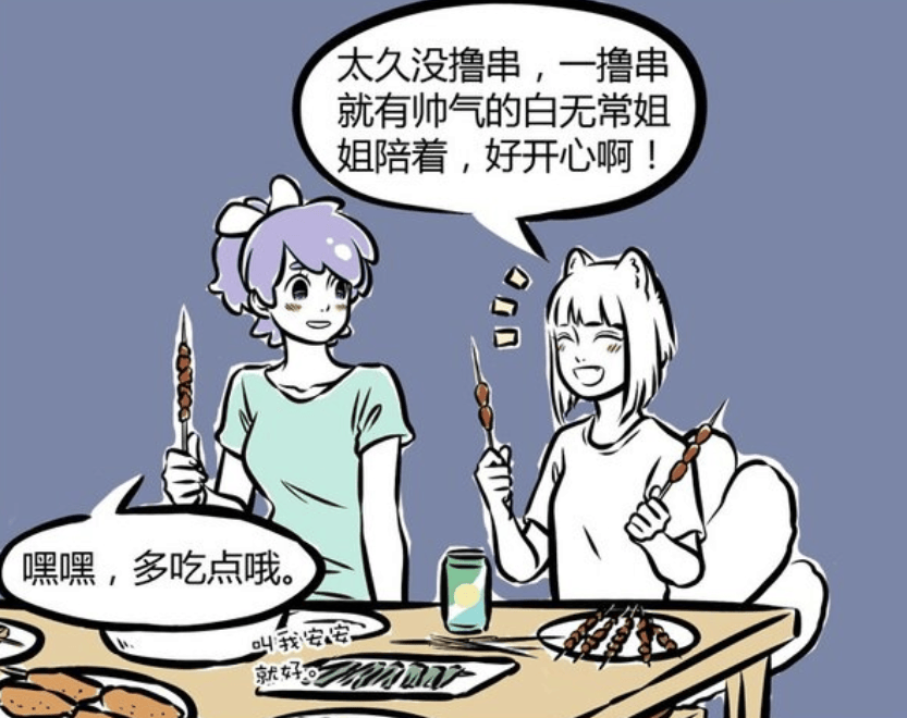 所谓一回生、二回熟、三回四回是朋友,九月和谢安就这样成了朋友。不得不说九月的社交能力,那是杠杠的,以后都能说,“我地府里有人”。九月还带着谢安去撸串,看起来谢安也能接受这种人间美食。